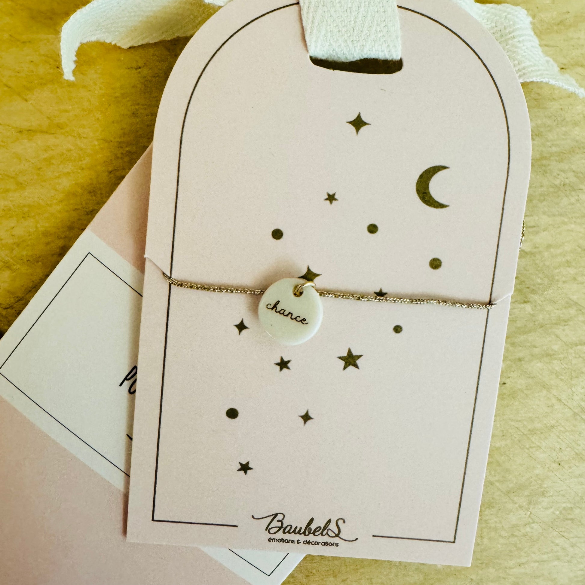 Un joli bracelet porte bonheur, avec un cœur doré posé délicatement sur sa porcelaine.